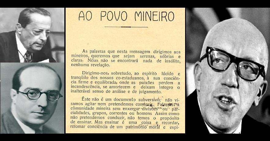 Em 24 de outubro de 1943, com seis anos da ditadura varguista do Estado Novo, e dois meses após nossa Pátria declarar guerra ao “Eixo” nazifascista, 92 intelectuais deram o início à luta por nossas Minas Gerais e pelo nosso Brasil. Eram os homens da resistência democrática que, mais tarde, por alguns deles, daria base para a UND (União Nacional Democrática). Como explica o historiador Souza Sobrinho, em A importância de Minas na Política Nacional, “nenhum deles buscava vantagens pessoais e nem se rendia a pretextos sutis da ditadura. Nação e poder público se divergiam. Era a primeira manifestação coletiva de protesto contra o Estado Novo e, embora o ditador só acreditasse na força, deveu desconfiar de que as ideias também constituem uma força, e muito mais válida do que a força bruta.” (Souza Sobrinho, 1973). Mais uma vez não podemos deixar de lembrar de Pedro Aleixo, como exemplo de democrata liberal conservador: foi cidadão de coragem em 1937, 1943 e quando do AI-5 de 1968, sendo contrário ao Ato Institucional defendido inclusive pelo marxengelsiano Delfim Neto.