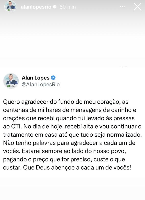A alta hospitalar foi comunicada pelo próprio Alan Lopes por meio de uma postagem em seu perfil oficial no Instagram. Na publicação, ele agradeceu as mensagens de carinho e as orações que recebeu durante o período em que esteve hospitalizado. O deputado afirmou estar confiante na plena recuperação.