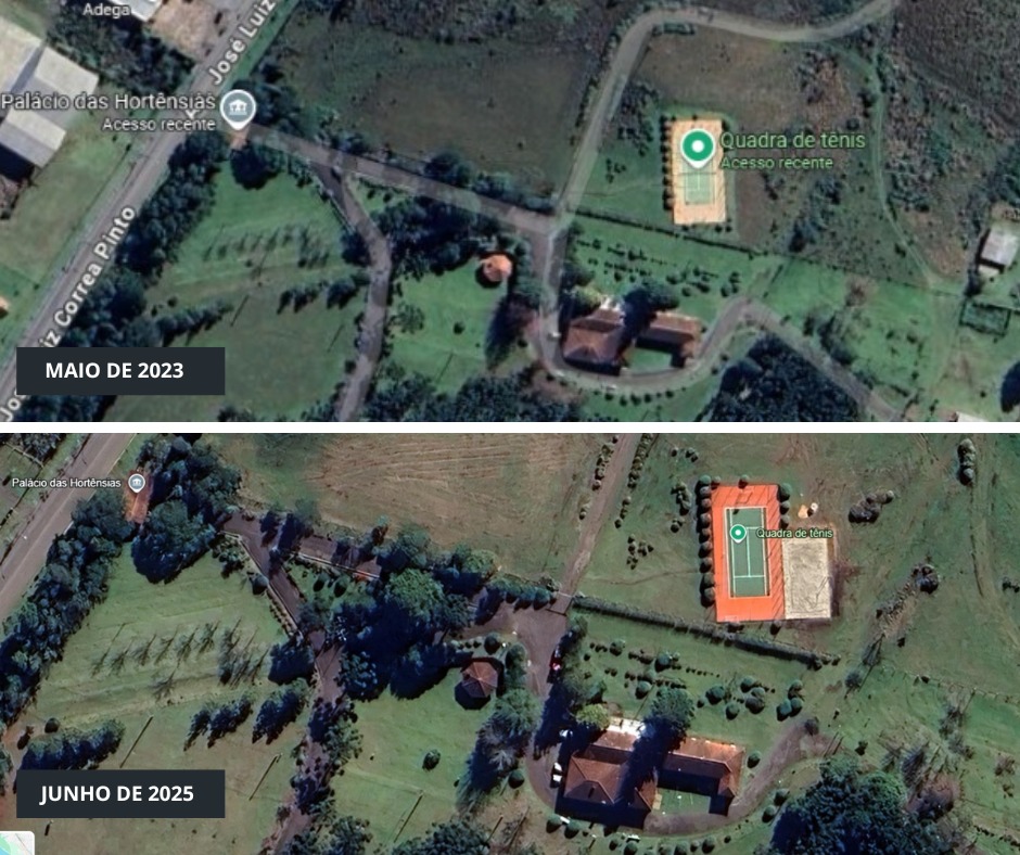 Na descrição do contrato, consta “material para a quadra poliesportiva Canela”, com entrega prevista para o endereço do Palácio das Hortênsias. Imagens de satélite anexadas à representação indicariam a existência de uma nova quadra ao lado de outra já destinada ao tênis.