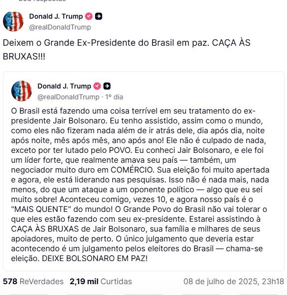 “Deixem o Grande Ex-Presidente do Brasil em paz. CAÇA ÀS BRUXAS!!!”, escreveu Trump em caixa alta, reforçando o tom de indignação.