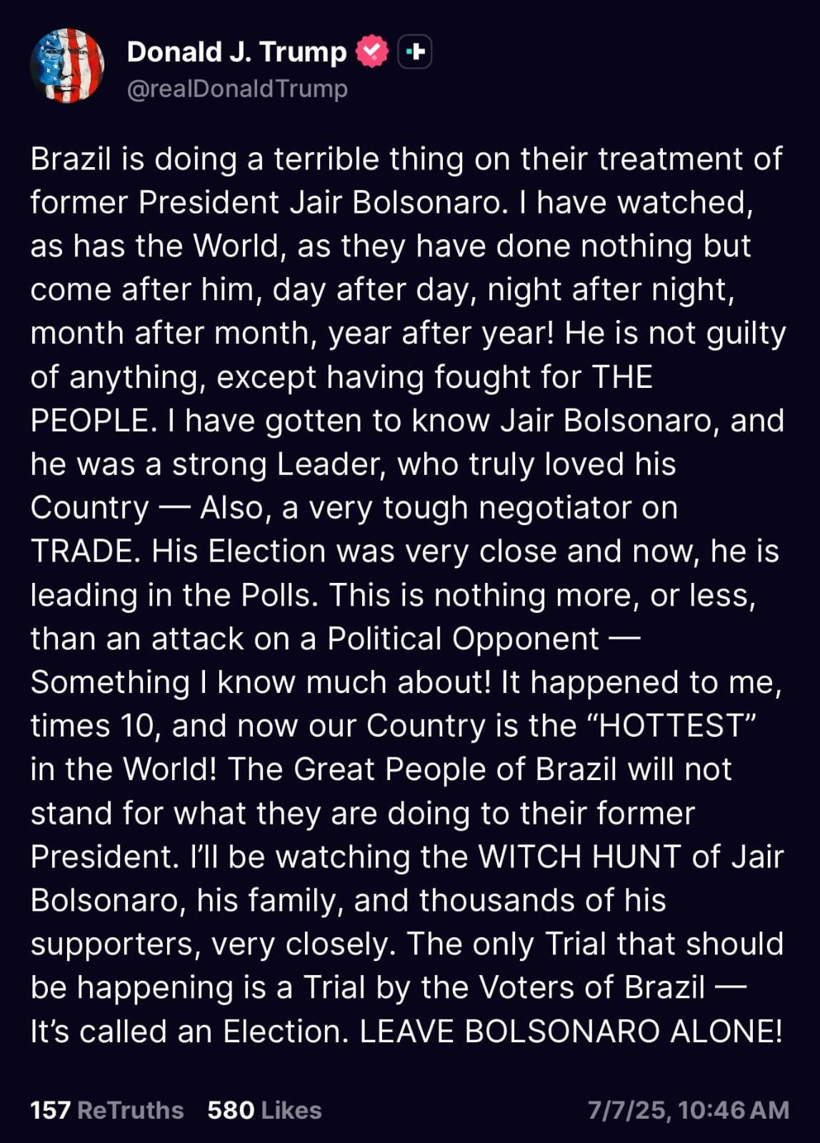 O Presidente dos Estados Unidos usou sua rede social Truth Social nesta segunda (7) para publicar uma mensagem em apoio ao ex-presidente brasileiro Jair Bolsonaro, que enfrenta julgamento no Supremo Tribunal Federal (STF) por "tentativa de golpe de Estado". Na publicação, Trump chamou o processo de "caça às bruxas" e pediu que Bolsonaro fosse deixado em paz, afirmando que “o único julgamento que deveria ocorrer é o do povo brasileiro — chama-se eleição”.
